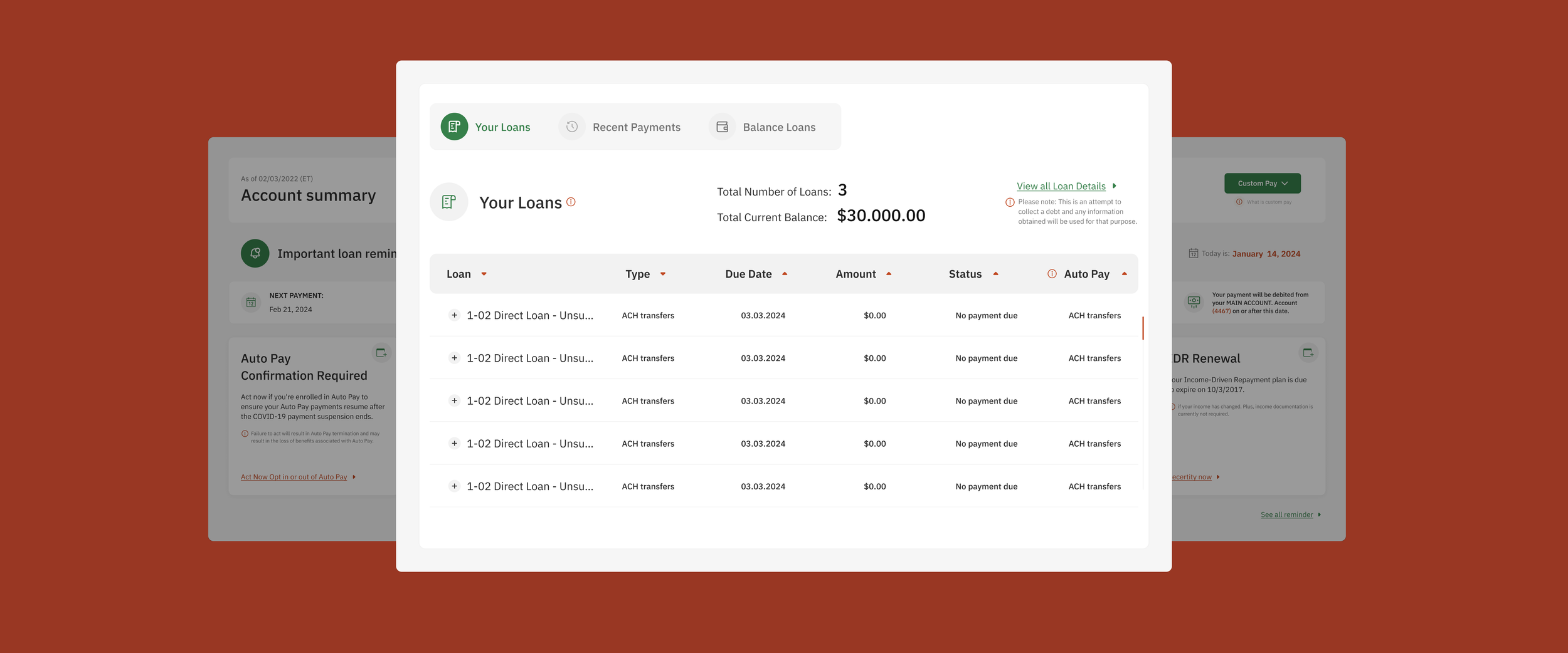 We started with a quick discovery sprint—reviewing the original UI, aligning with the brief, and simulating a real stakeholder review. I also ran informal interviews with peers who manage or have managed student loans.