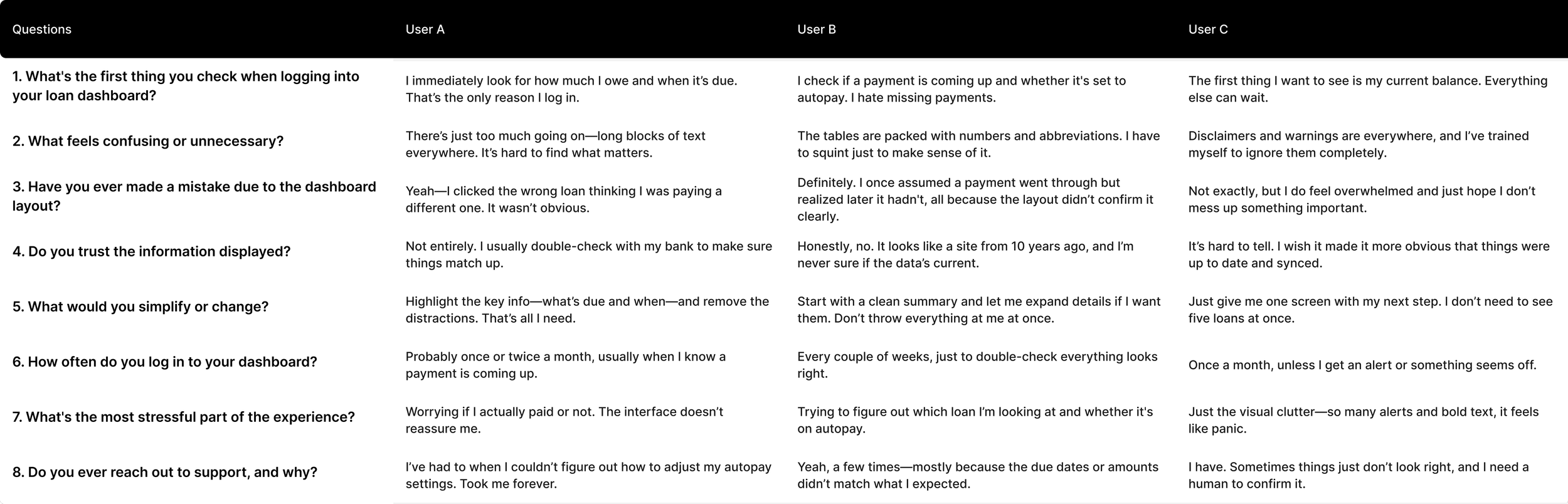 I spoke with 3 individuals managing student loans to dig deeper into how they interact with repayment dashboards. Rather than focusing on surface-level usability, I structured the conversations around intent, frustration, and decision-making behaviors.