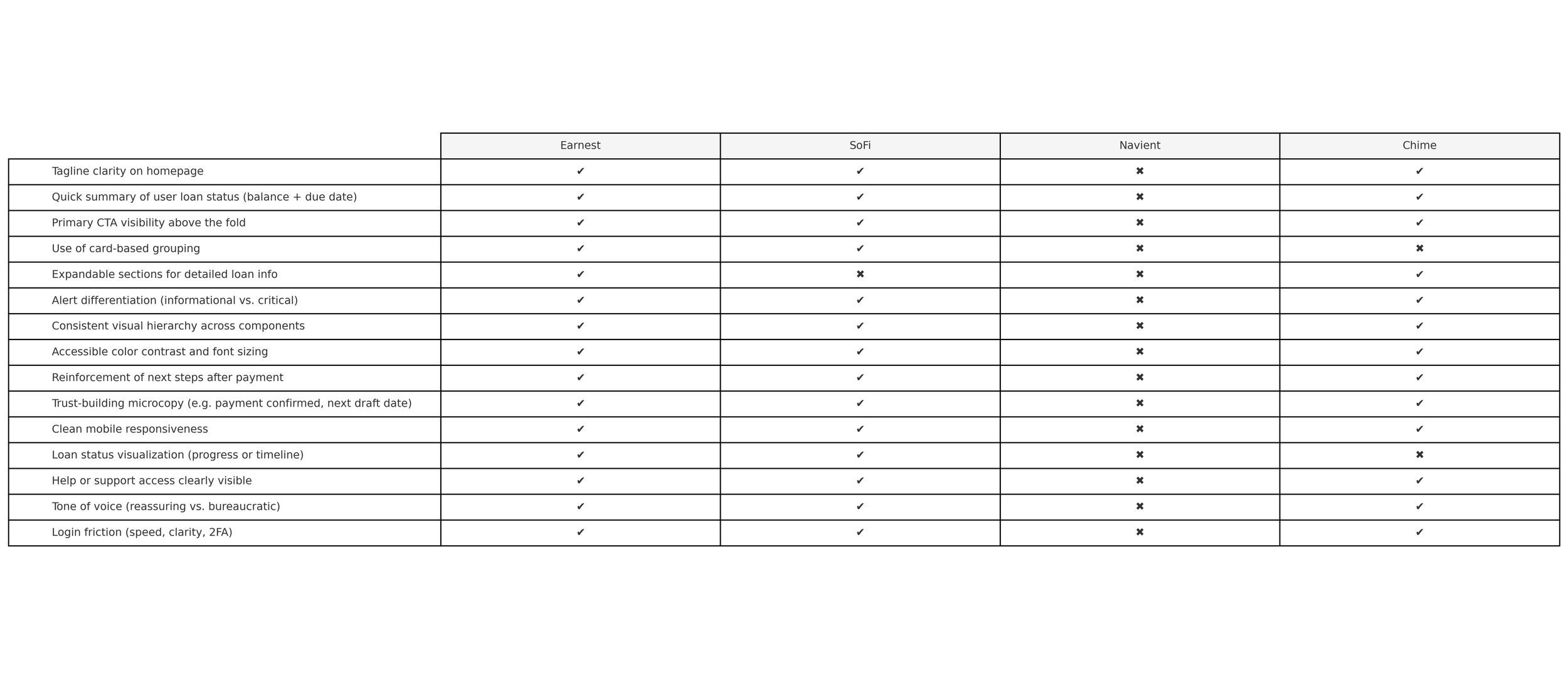 → Chime – While not loan-specific, Chime’s approach to simplifying financial info helped inform how to visually calm the experience.